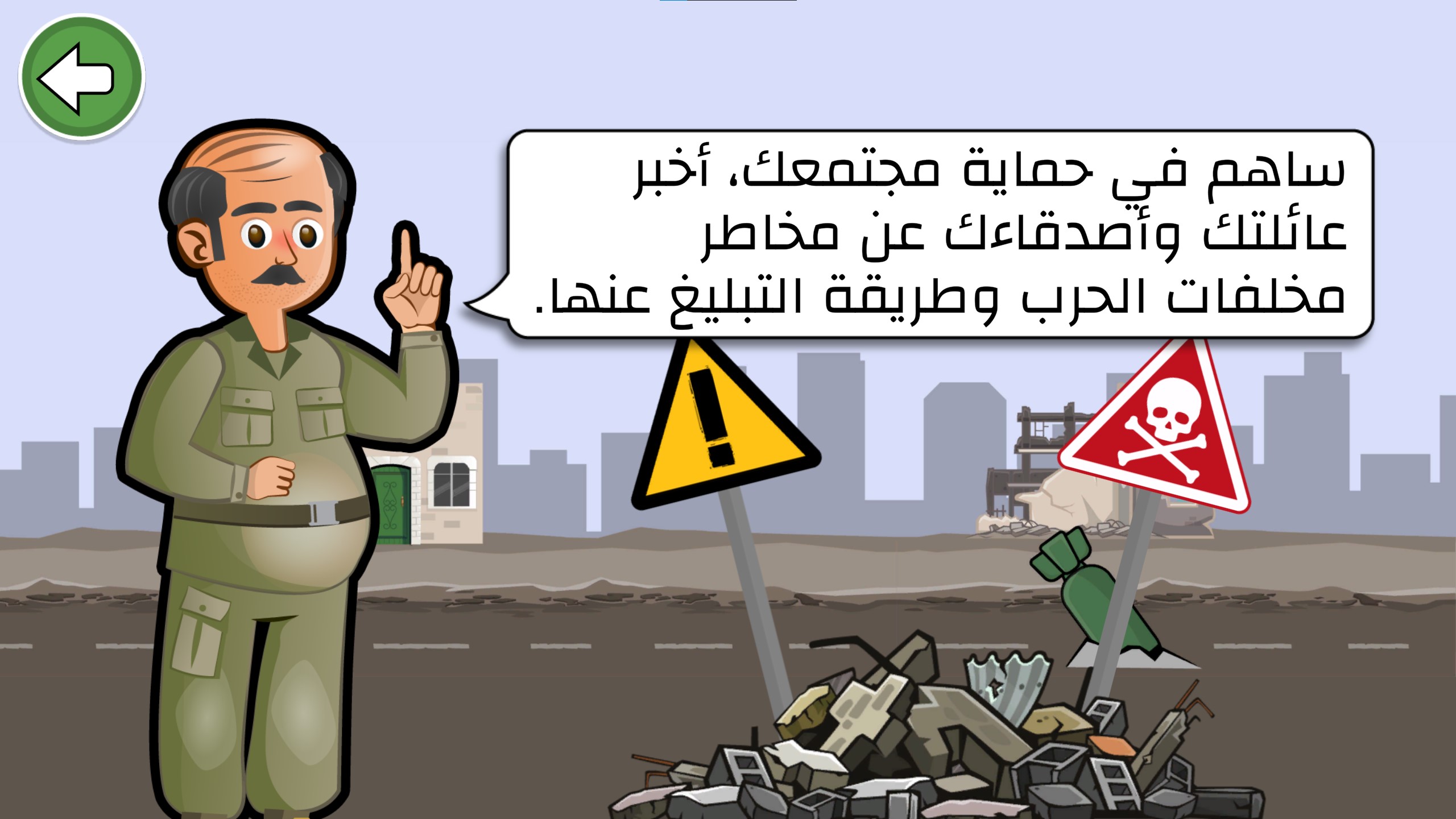 This game was created to highlight the dangers of mines and war leftovers in the lands of Palestine, each level gives the player a piece of advice as a reward for winning about how to deal with specific issues related to mines and war leftovers in case found by anyone.